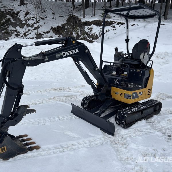 JD 17P, CANOPY, TRACK RUBBER 75% BON, JOYSTICK, ATTACHE RAPIDE MECANIQUE DE GODET, POUCE HYDRAULIC, GODET RIVAR 18 », GARANTIE 2000HRS / 19 AVRIL 2027 JD,