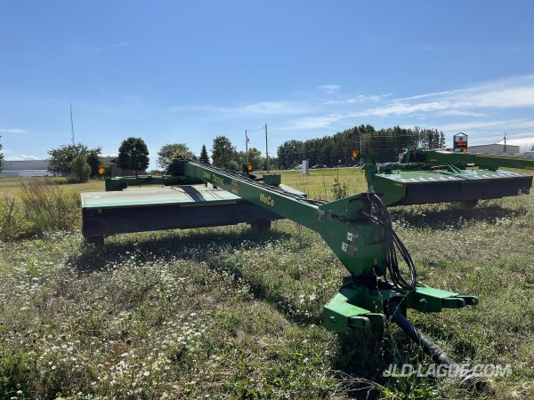 JD 956, 14.5′, PIVOT CENTRAL, COND. FLEAUX, FAUCHEUSE A DISK, ATTACHE 2 POINTS, TETE GYRONDINE, PTO 1000 1 3/8, AJUSTEMENT D’ANGLE DE COUPE HYDRAULIC, PNEUS 31X13.5 25% BON,
