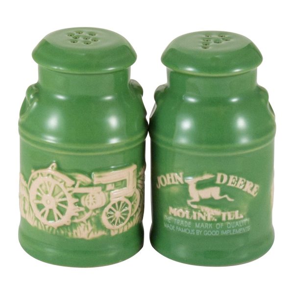 This unique salt and pepper set is sculpted in the shape of two milk cans. The high quality stoneware is decorated with a raised relief farm scene wrapping around the body of both the salt and pepper shaker. The set is glazed cream and green. Dishwasher safe. Made in China.