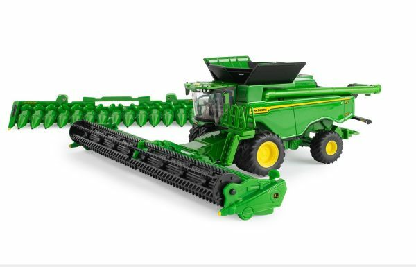 Features include die-cast body, clear windows, dual front wheels, and detailed interior. The feeder housing raises and lowers. Rotating unloading auger and pivoting ladder. Includes folding C16F corn head and HD50F draper head.