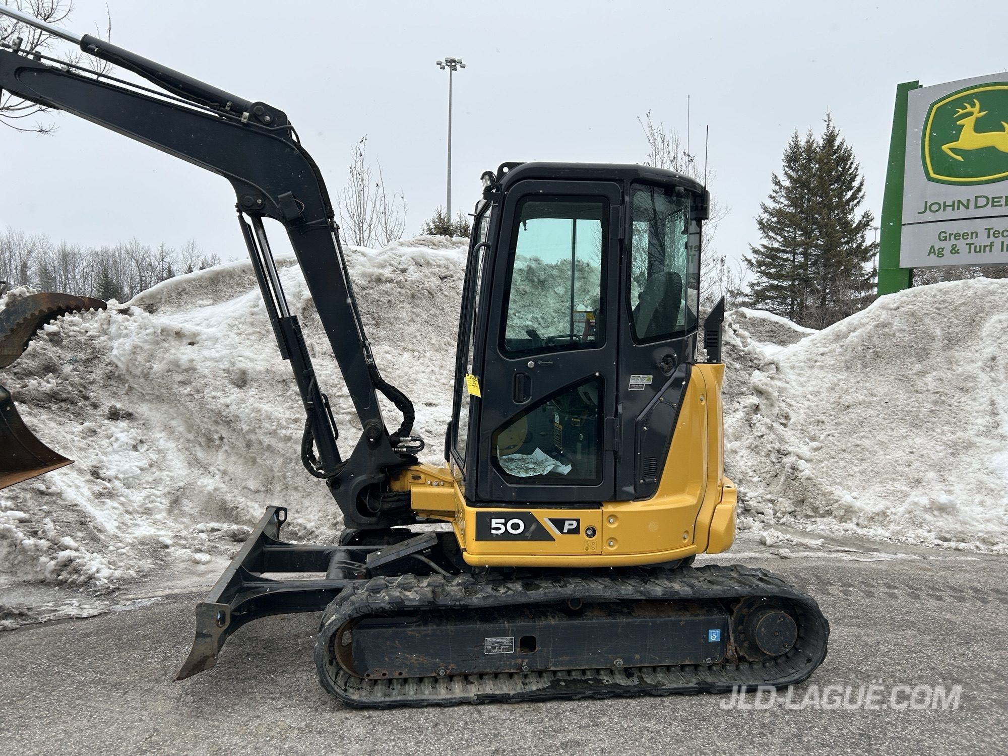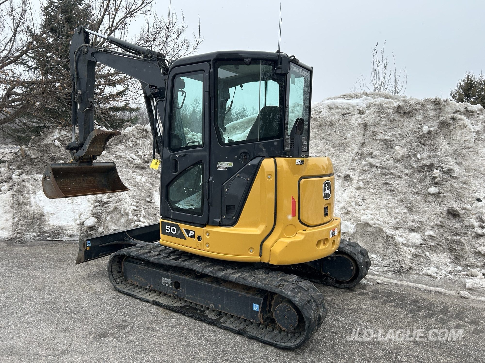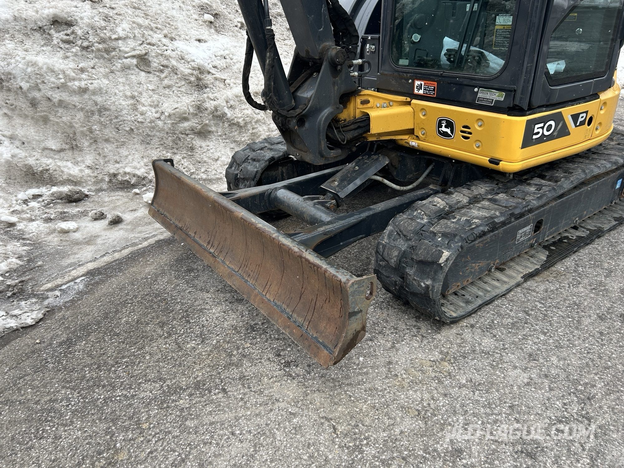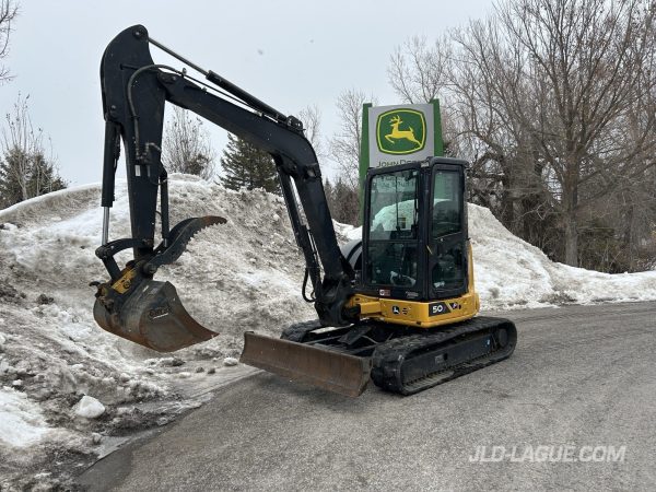 JD 50P, CAB W/ A/C, RUBBER TRACK 25% GOOD, JOYSTICK, MANUAL BUCKET QUICK TACH, HYDRAULIC AUX. OUTLET, HYDRAULIC THUMB, 30” BUCKET, 48′ BUCKET, WARRANTY 2000HRS / APRIL 15 2029 JD,