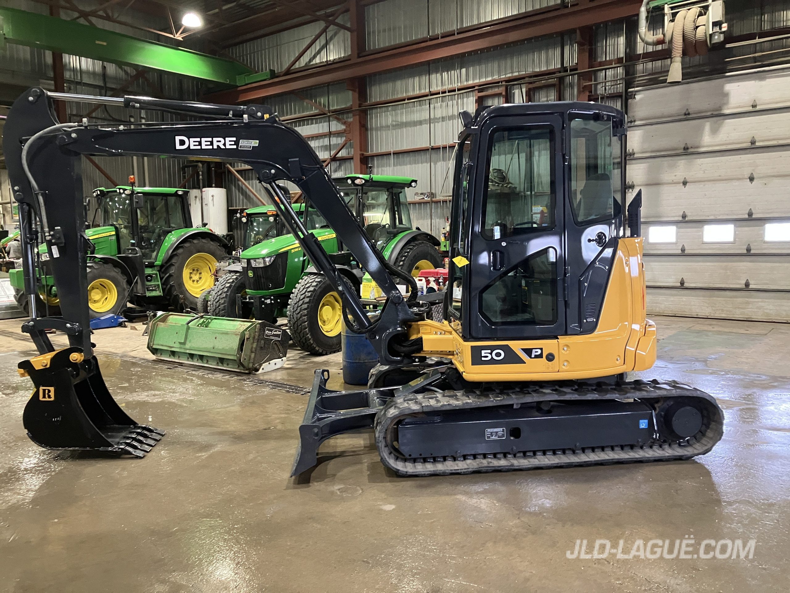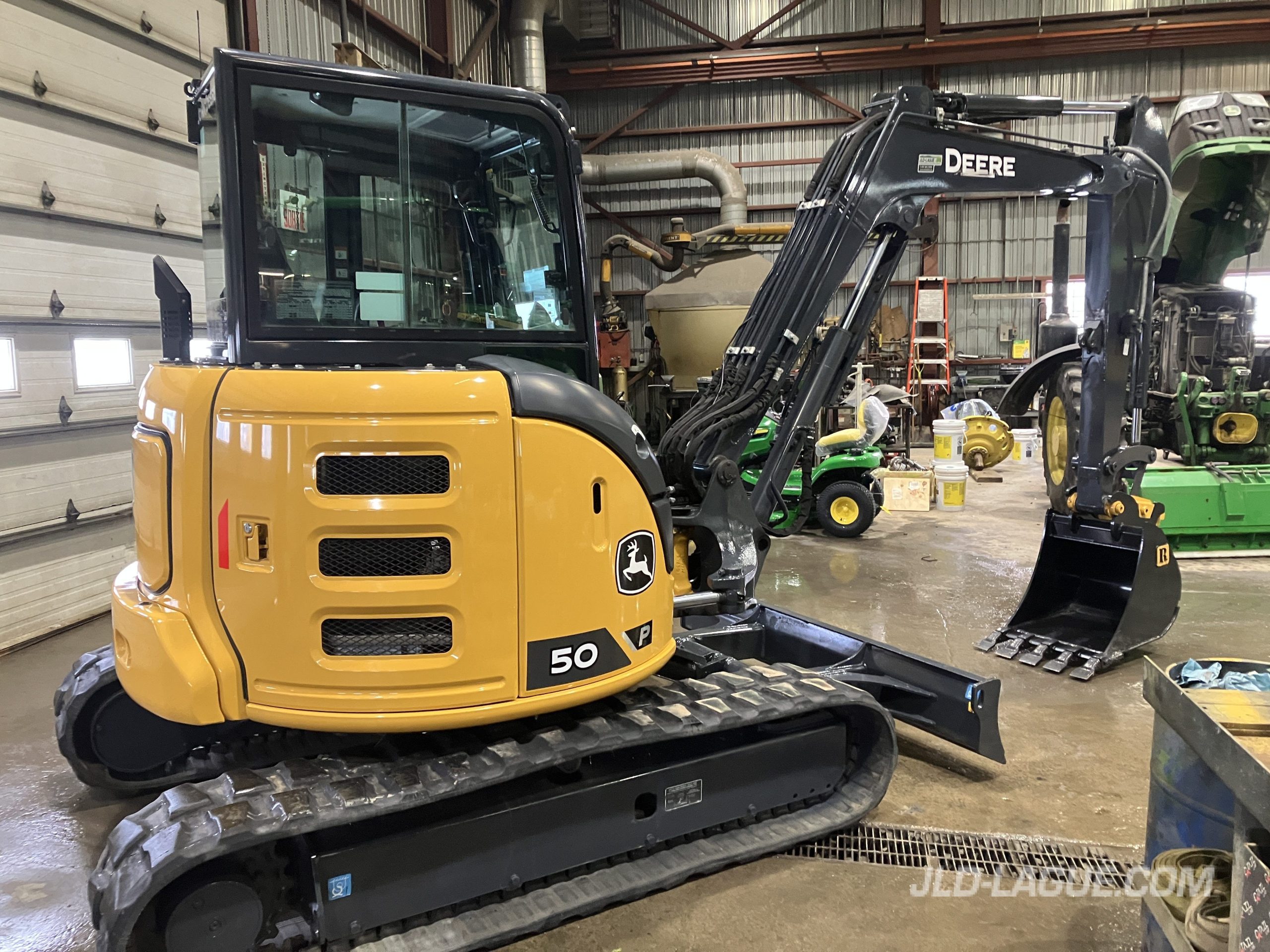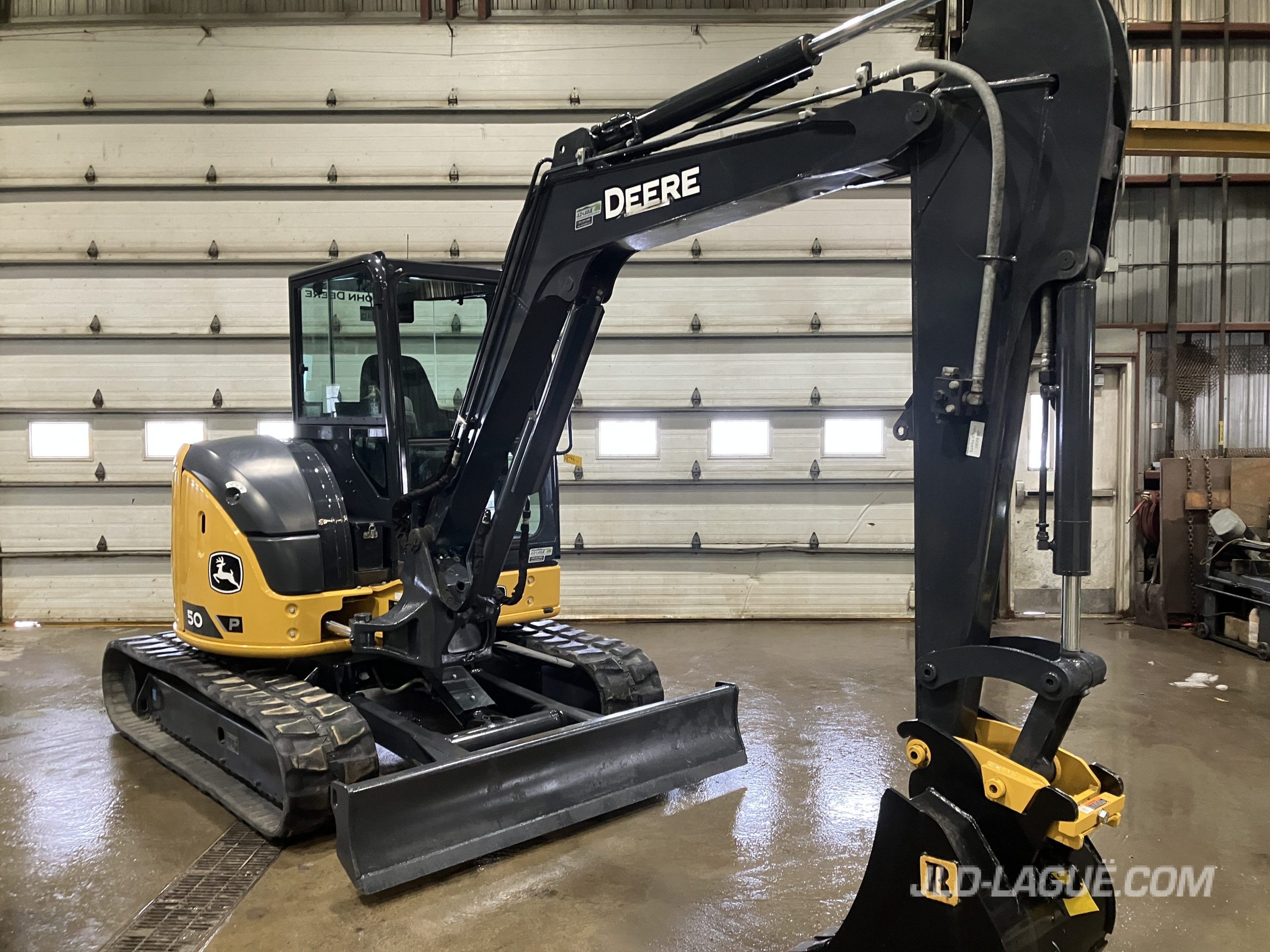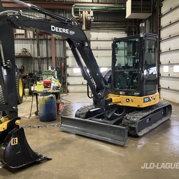 JD 50P CAB W/ A/C, RUBBER TRACK 90% GOOD, JOYSTICK, MECHANICAL BUCKET QUICK TACH, HYDRAULIC AUX. OUTLET, 24” RIVARD BUCKET, WARRANTY 2000HRS / OCT. 25 2026 JD ,