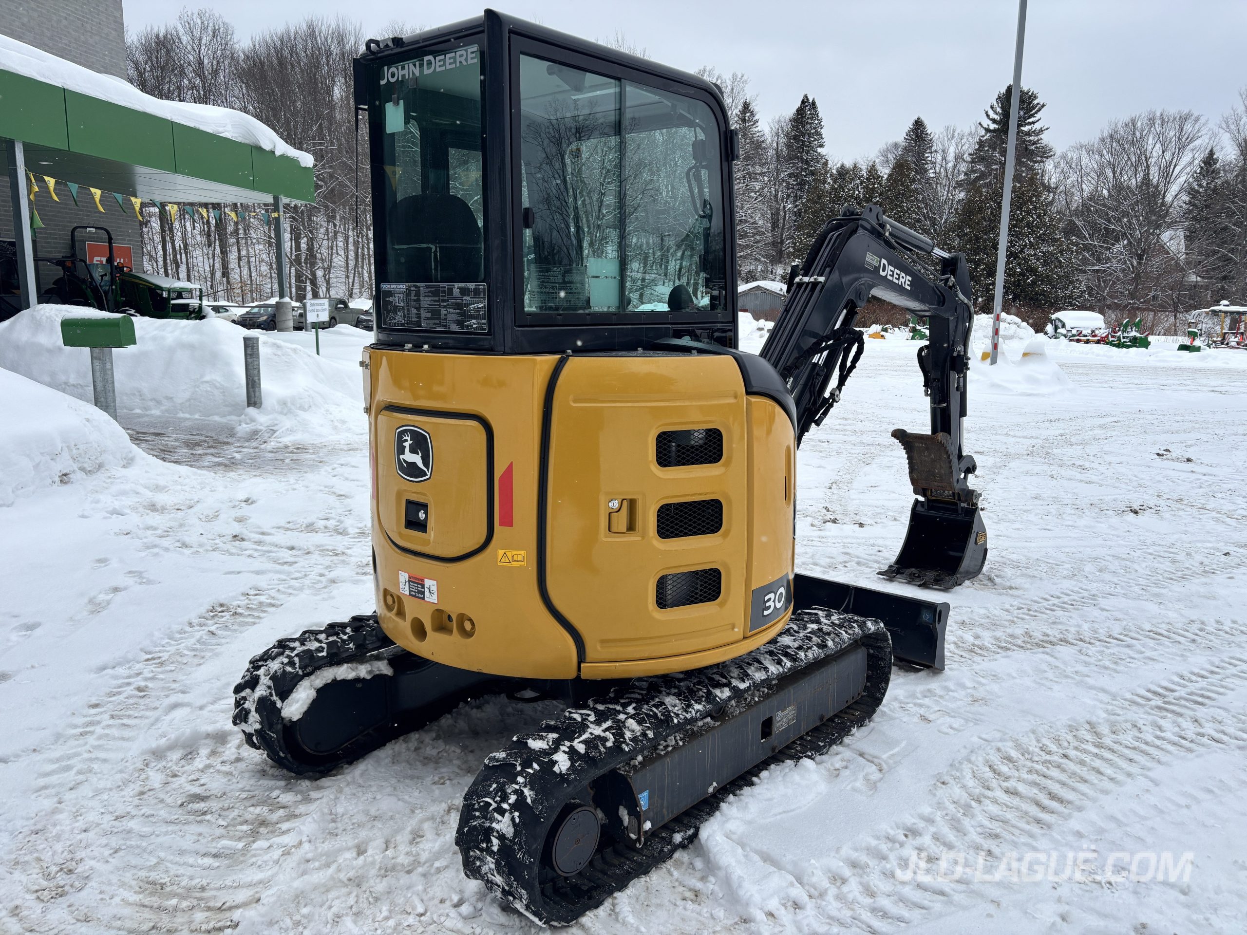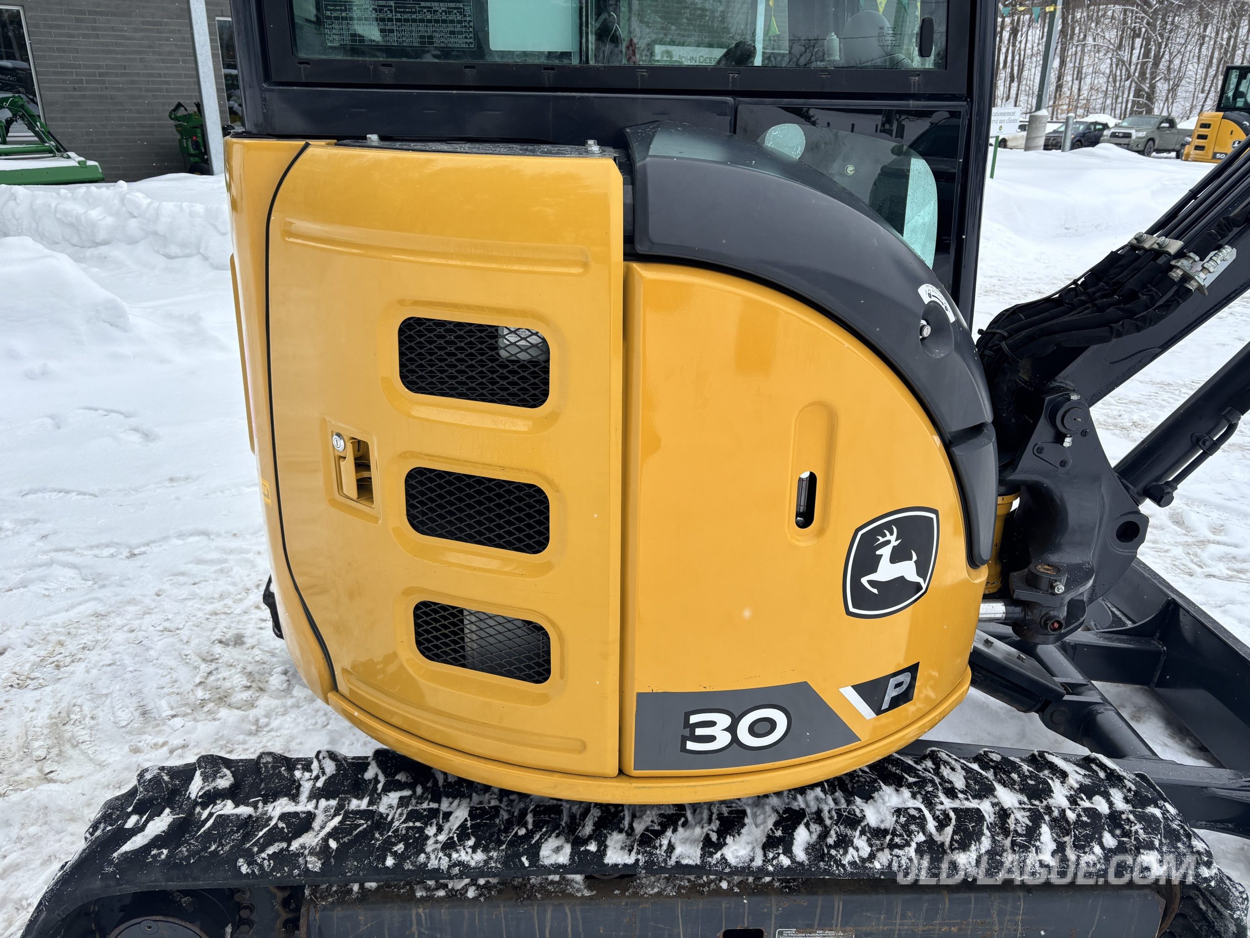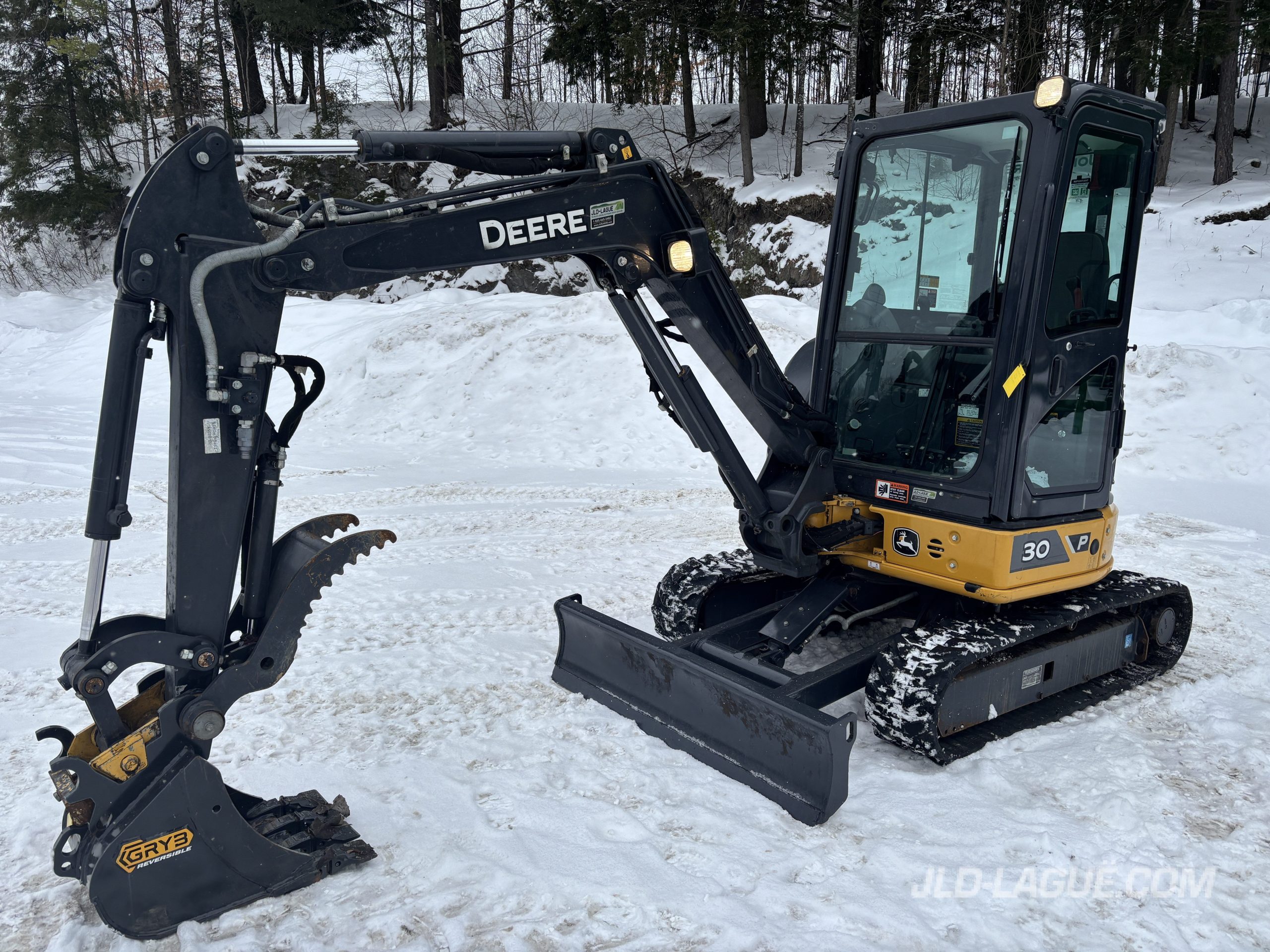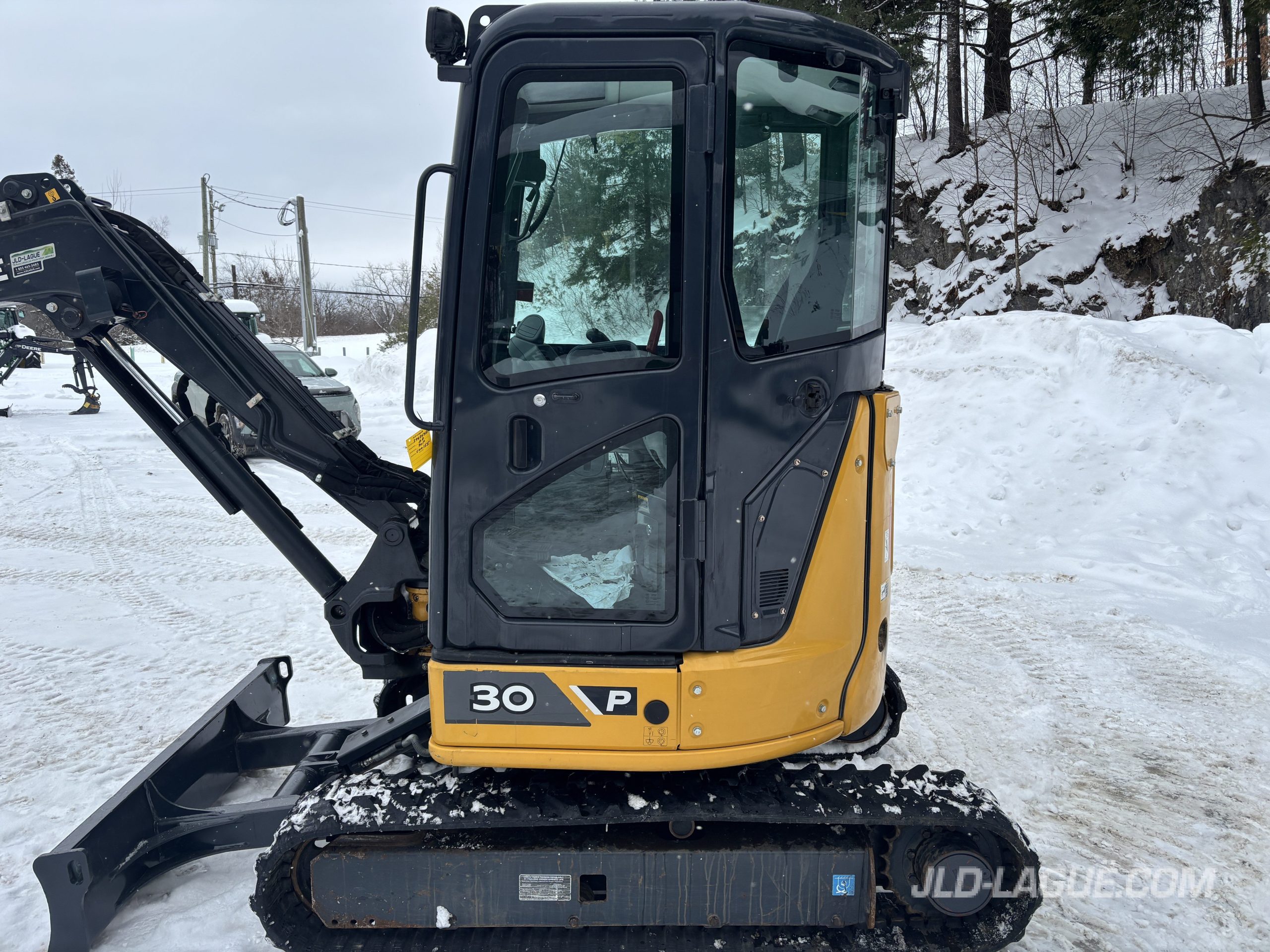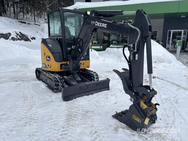 JD 30P CAB W/ A/C, RUBBER TRACK 75% GOOD, JOYSTICK, MECHANICAL BUCKET QUICK TACH, HYDRAULIC AUX. OUTLET, HYDRAULIC THUMB, BUCKET GRYB 16” INCLUDE, WARRANTY 2000HRS / APRIL 19 2027 JD,