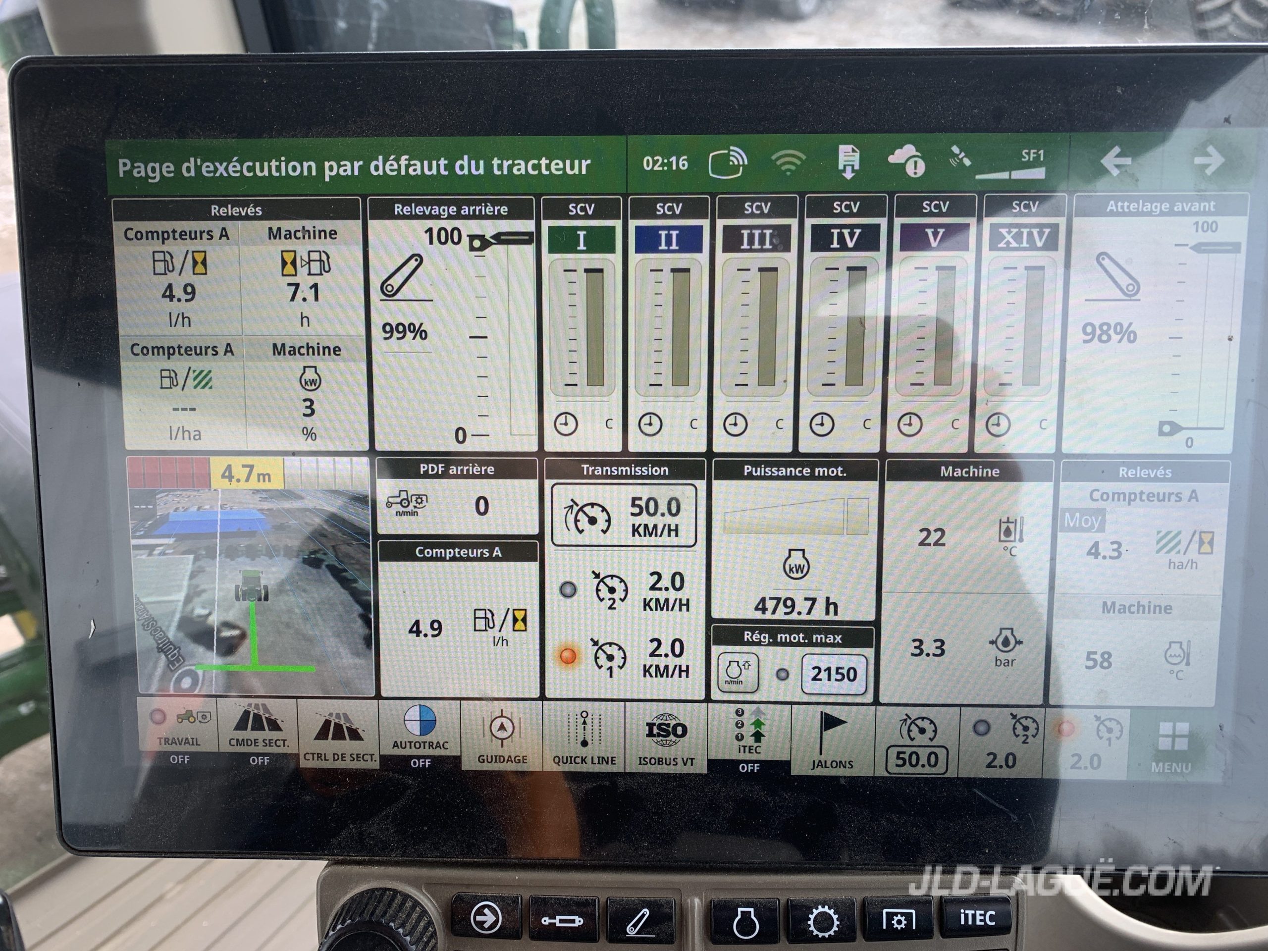 ENGINE HP 410, PTO HP 310, TRANS. EVT 50KM LHR ”COMMAND-PRO” 480/95R50, GY R1W 75% GOOD, 480/95R50, GY R1W 75% GOOD, AXLE DUAL, 420/85R34, GY R1W 75% GOOD, 420/85R34, GY R1W 75% GOOD, HUB DUAL, 5 SCV, PTO 1000 1 3/4, ULTIMATE CONFORT CAB, SUSPENDED ACB, MULTI-CONTROLER SHIFTER STICK ”COMMAND-PRO”, FRONT FENDERS, REAR FENDERS EXT., REAR WIPER, HELPER SEAT, MIRRORS, LEATHER SEAT, EXTREMITY LIGHTS, ULTIMATE VISIBILITY LIGHTS PKG, ILS FRONT AXLE SUSPENDED W/ FRONT BRAKE, FRONT 3PTS HITCH W/ SCV, HYDRAULIC TRAILER BRAKE, REAR 3PTH DRAFT LINK HOK END, EUROPEEN TYPE, REAR WHEEL WEIGHT, 620KG + 70KG / WHEEL, G5 PLUS PROCESSOR, 12.8” COLOR DISPLAY, JD LINK 4G CAPABLE, AUTOTRAC READY, SECTION CONTROL, DOCUMENTATION, ISOBUS TERMINAL, JD 7500SF1 GPS RECEIVER, WARRANTY 1500HRS / MAY 7 2028 JD,